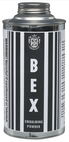 BEX is an embalming powder of great strength. It is designed to correct adverse conditions in which a powder treatment is indicated. BEX is ideal for treating traumatic conditions producing a moist surface. It will cling to the surface, dry, embalm and deodorize the area. A pound of BEX sprinkled inside the cavity will perform more effectively than would a standard cavity fluid. BEX will not gravitate away as would a liquid. It will remain where placed, dry, embalm, disinfect and deodorize.