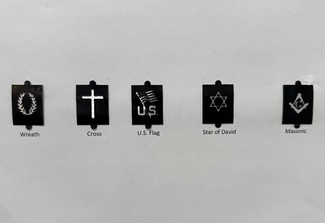 Funeral Home Imprint and your choice of emblem are included. Emblem options: Wreath, Cross, US Flag, Star or David, or Masonic (4th picture). Includes assorted box of numbers and letters. 8.5" x 4.25". Sold in lots of 25