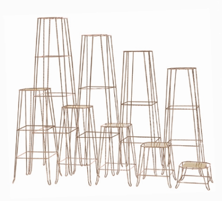 Set of 9: Heavy gauge wire nesting baskets stands are electrically welded and cross-braced for rigidity and extra support. Available in Gold epoxy powder coat. Top has a flat metal steel plate welded to give more support and legs are curved at feet for extra stability. Can be stored in only 16 inches of space. Consists of: 7", 13", 19", 25", and 31" high basket stand. Consists of: 7", 13", 19", 25", 31", 37", 43", 49" and 55"